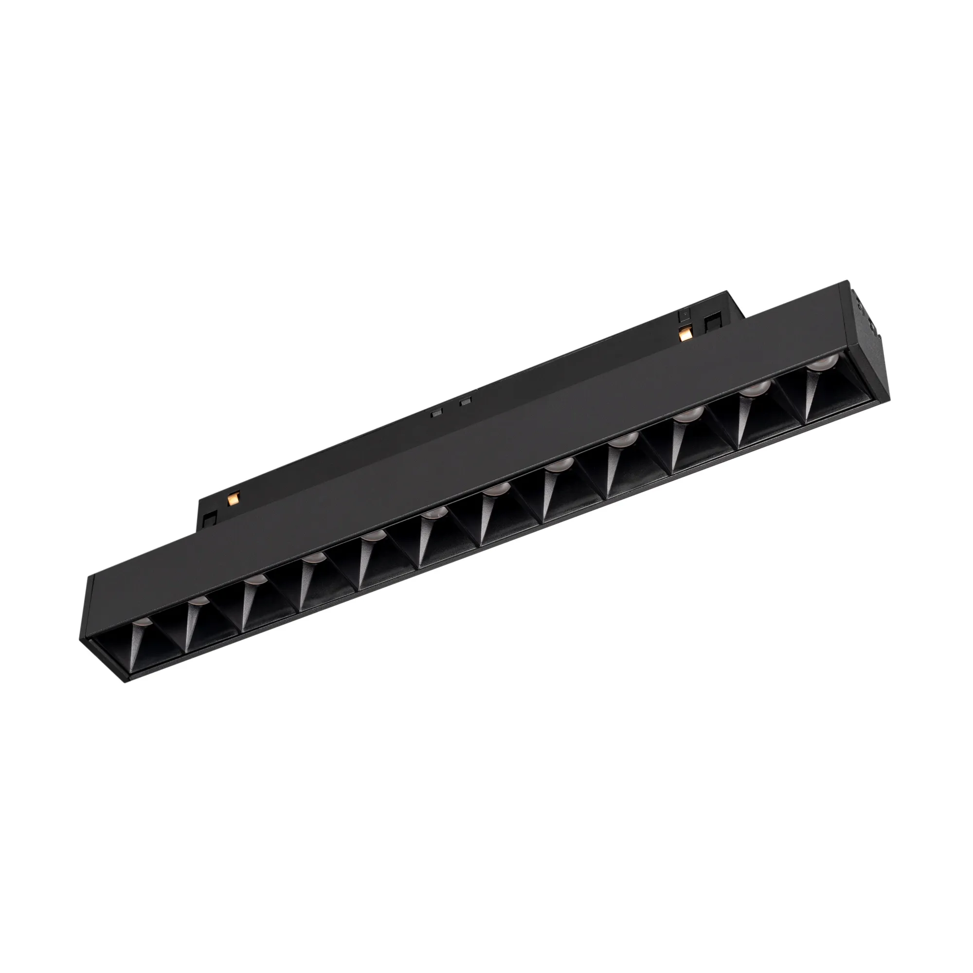 Светильник для магнитных треков MAG-ORIENT шириной 26 мм. Мощность 8 Вт, св. поток 360 лм, 45 лм/Вт, теплый 2700 K, CRI>90, угол24°, напряжение питания 48 В. Черный прямоугольный корпус из металла, экран поликарбонат, степень защиты IP20. Размер: длина 235 мм, ширина 22 мм, высота 42 мм. Монтаж на трек MAG-ORIENT. Пульсация <1%.